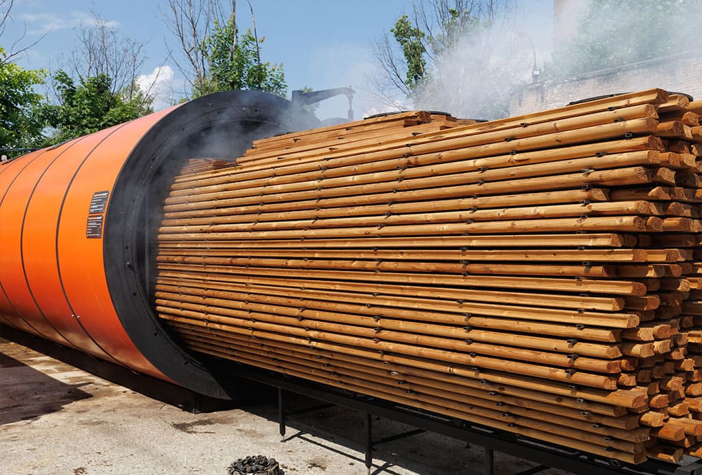 Процесс происходит в среде насыщенного пара, при допустимом избыточном давлении 0,65 Атм. Благодаря этому древесина не пересушиваешься до 0% влажности и не подходит к состоянию, которое близко к пиролизу. В результате материал не имеет неприятного жжёного запаха, колкости, имеет гораздо большее напряжение на излом, а влажность на выходе составляет 2-4%.